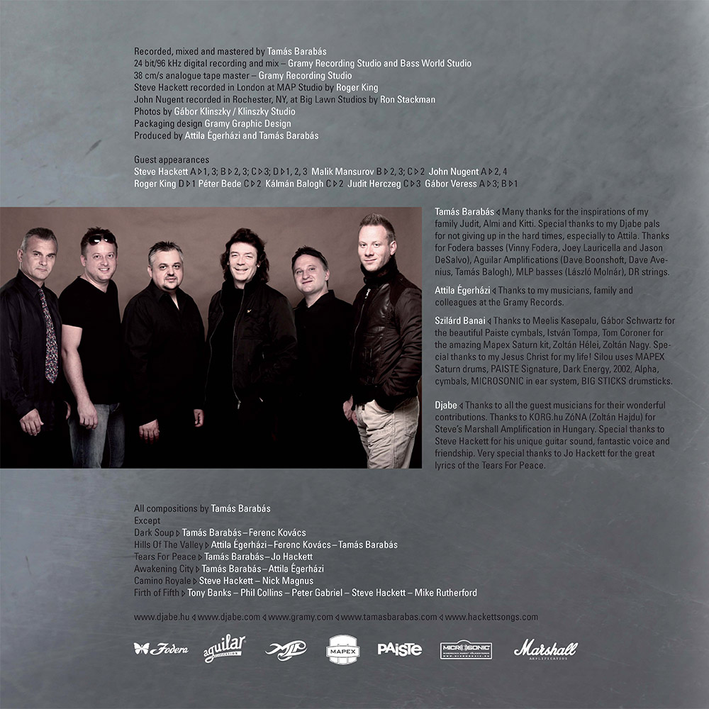 Ferenc Kovács brings his special musical ability on the trumpet and violin. The lyrics he wrote for song The Dark Soup is of outstanding in its depth, and he performs it in his characteristic singing style. Zoltán Kovács’s piano and keyboard playing have become an ever increasing important element of Djabe’s music wonderfully confirmed throughout this album. Guest artists enrich this album with special colours through being exceptional musicians and through the musical instruments themselves. Steve Hackett (UK) plays the guitar and sings, John Nugent (USA) plays the tenor saxophone, Malik Mansurov (AZ) plays the ancient tar. From among the Hungarian musician friends Kálmán Balogh plays the cimbalom, Péter Bede plays the shepherd flute, Judit Herczeg is doing backing vocals and Gábor Veress plays the flute. The significance of the album is proved by the fact that the label, Gramy Records, has launched it on the market in all important physical media formats. Besides the CD version, the sixty-two minutes material is also released on a double vinyl LP, on three sides of the record. On the fourth side, as a bonus, one studio and two concert recordings can be found of Djabe special guest Steve Hackett line-up.