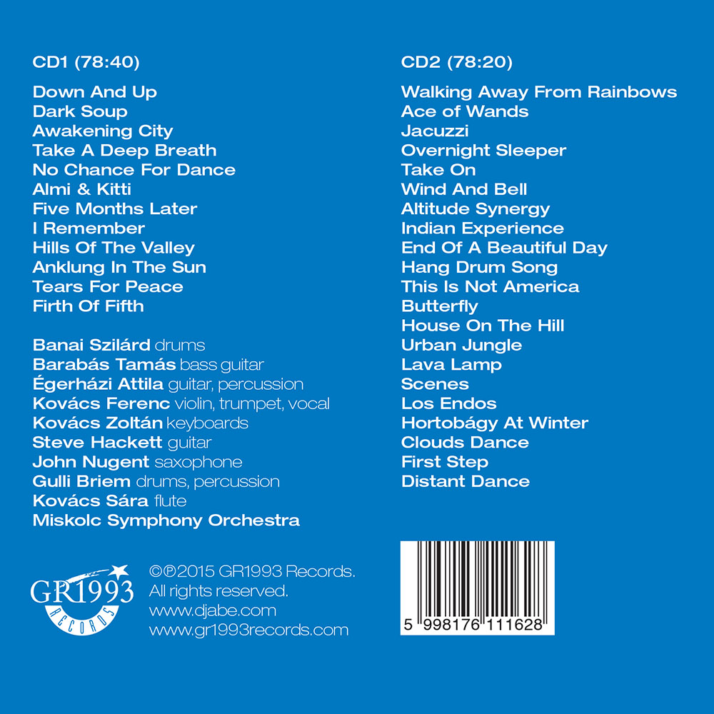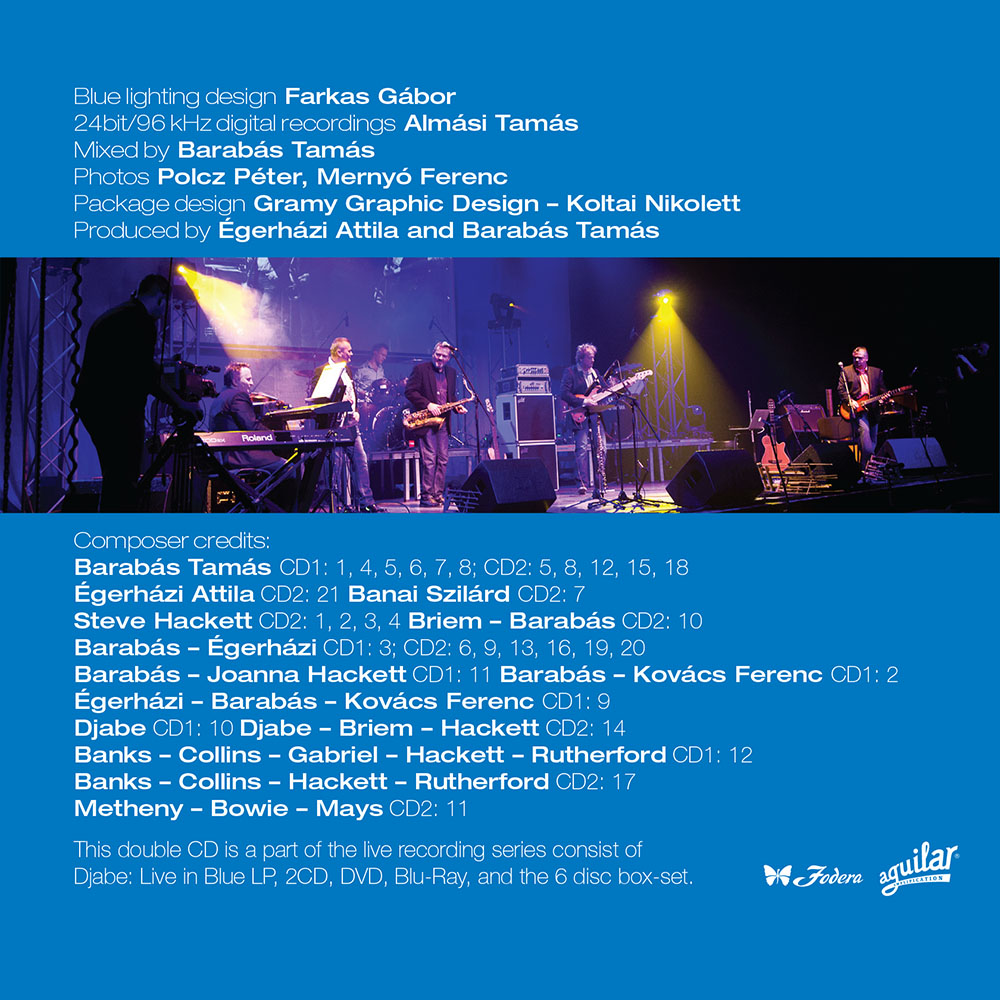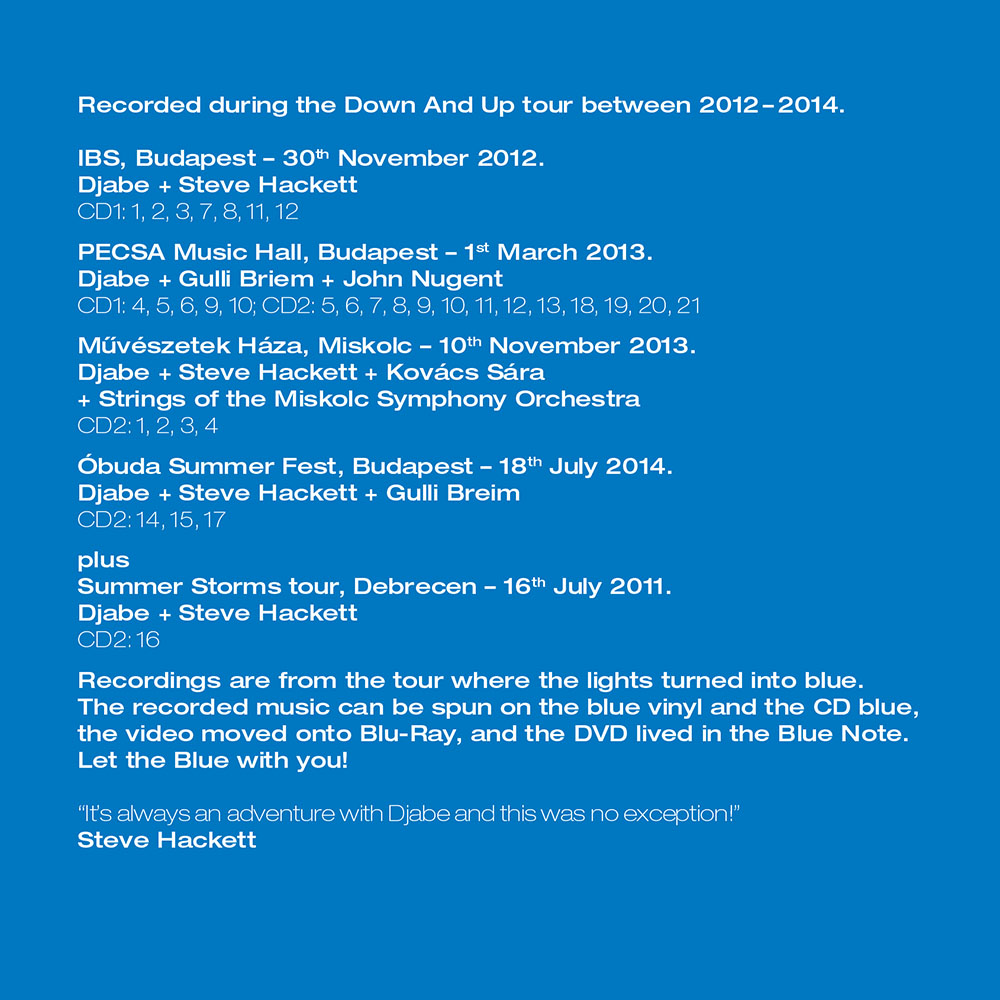 The recordings made at the Down And Up stereo and surround tours during 2012 – 2014. This is the second part of the Djabe: Live in Blue LP, 2CD, DVD, Blu-ray series. The length of the two CDs together is 158 minutes. There is only 32 minutes common content with the LP. The 2 CD contains 80 minutes music not can be found on the Blu-Ray. Djabe in 2012 in connection with the Down And Up album release started a concert series in Hungary, Europe and Canada. The tour lasted until the summer of 2014. The gigs are often joined by friends of the band. Steve Hackett played guitar from Genesis, Gulli Briem of Mezzoforte added drums and percussion, living in New York the Canadian born saxophonist John Nugent (Tony Bennett, Ella Fiztgerald) completed the list of guests. The Miskolc concert on 10 November 2013 was particularly unusual because the Miskolc Symphony Orchestra and Sára Kovács on flute also contributed to the program. The 2CD represents each stage line-up of the all the gigs.