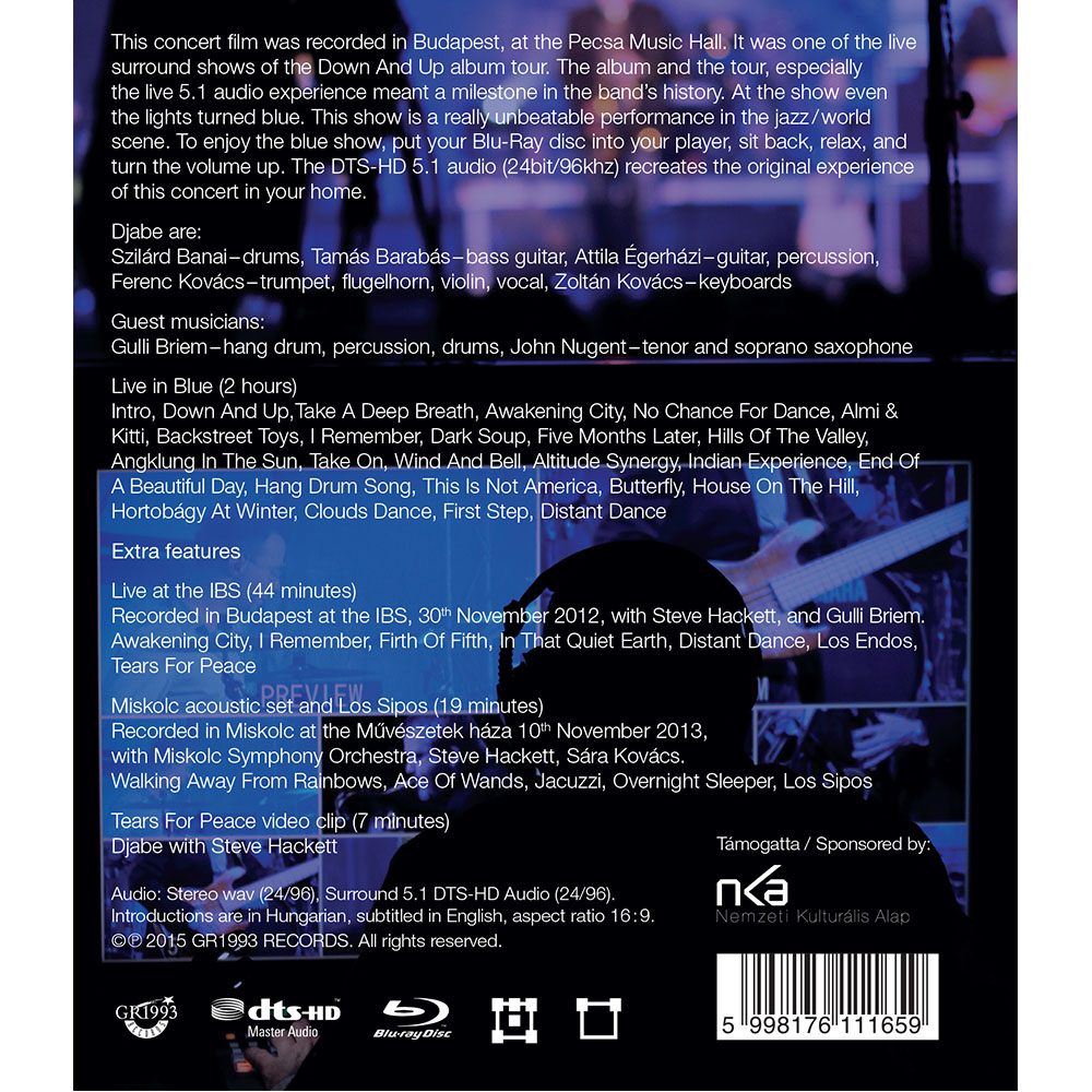 A Live in Blue című Blu-ray Disc a Djabe zenekar kék sorozatának harmadik kiadványa. A csúcsminőségű BD törzsanyaga nem más, mint a rendkívül jól sikerült Down And Up album domináns kék fényekkel kísért 2013-as surround lemezbemutató koncertjének teljes hang- és képfelvétele. Ezt követi bónuszként a 2012-es sztereo lemezbemutató koncert anyagából készült összeállítás, valamint egyéb érdekességek.A surround és a sztereo kitételek itt természetesen az élő koncertek hangosítására érvényesek, hiszen a korongon szereplő összes kompozíció a lehető legjobb minőségű 5.1-es surround hangzással élvezhető, melyek az eredeti soksávos, nagyfelbontású koncertfelvételek felhasználásával készültek, Barabás Tamás hangmérnök fantáziadús, profi keverésében.