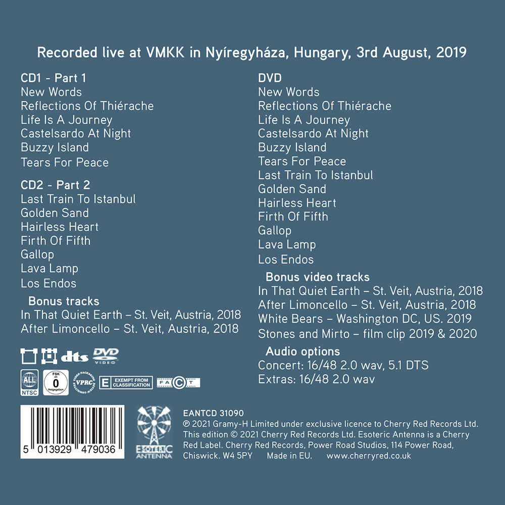 The NTSC / Region Free DVD in this set also includes the bonus features the tracks ‘In That Quiet Earth’ and ‘After Limoncello’, recorded in St. Veit, Austria in 2018 and ‘White Bears’, recorded in Washington DC in 2019.