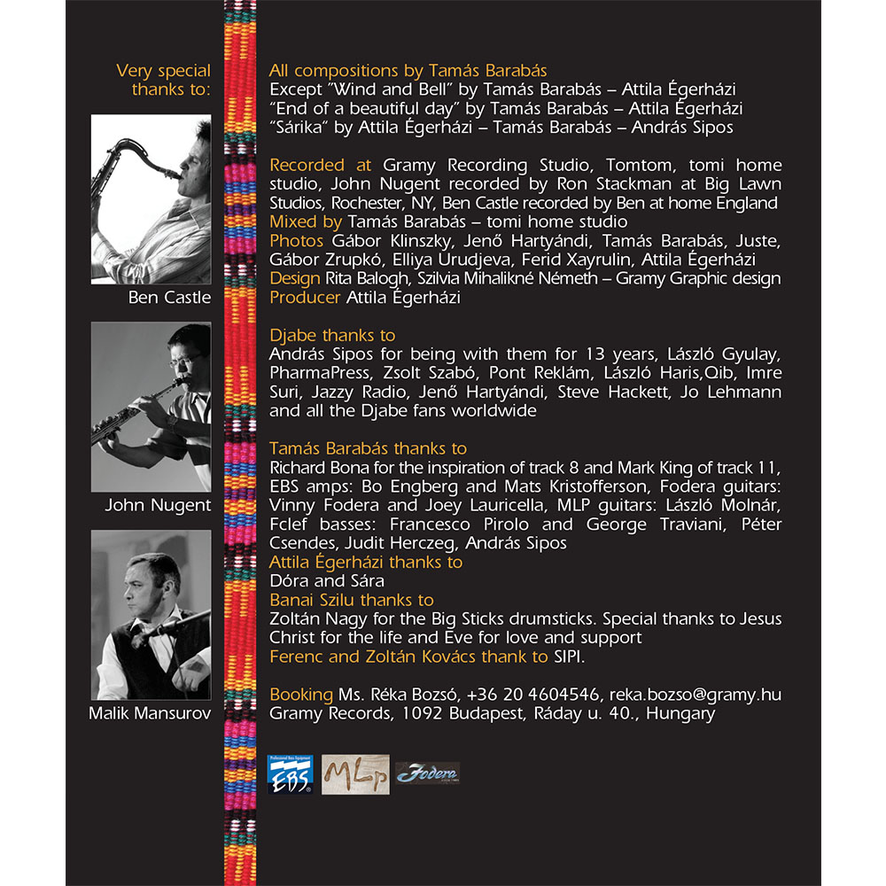 As we could get used to, great guest artists regularly participate on the Djabe albums. Herewith there are even two sax-players perform on the album. One of them is Ben Castle from England, who is a regular participant of the Djabe albums, and John Nugent from USA, who plays together with the band for the first time. A particular variety is the play of the world-famous master of tar-player, Malik Mansurov from Azerbaijan in the tune Kilinama. The composition Wind and Bell converts into Gipsy music at the end. Sándor Budai and his band represents a surprising turn in the world of Take on. The album summarizes all the knowledge that Djabe have learned and showed from music for 12 years.