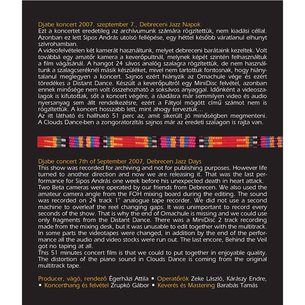 The 2007 album of Djabe is a worthy continuation of the band’s traditions and the values represented by them so far. The composing ability of Tamás Barabás integrates all the talent of the members of the band, creating a new quality by that. The compositions are fresh, unique, still sound familiar. World music form Hungary, Azerbaijan, approaching jazz from different ways in a specific execution. The members of the band play in their finest fettle. This album is the final work of András Sipos, singer and percussionist, since he almost entirely finished the recordings before his death. His singing misses from three songs…