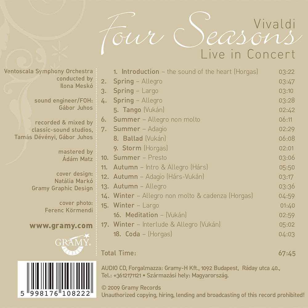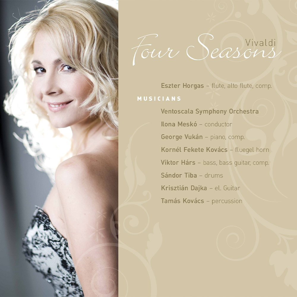 Horgas Eszter is one of the internationally acclaimed performers of the cross-over genre. This album also features classic and jazz elements chasing each other. Classic pieces of Vivaldi’s Four Seasons framed and segmented by jazz compositions. Vantescola Symphonic Orchestra conducted by Ilona Meskó. Jazz section by György Vukán (piano), Kornél Fekete Kovács (flugelhorn), Viktor Hárs (double bass), Sándor Tiba (drums), Krisztián Dajka (guitar), Tamás Kovács (percussion).